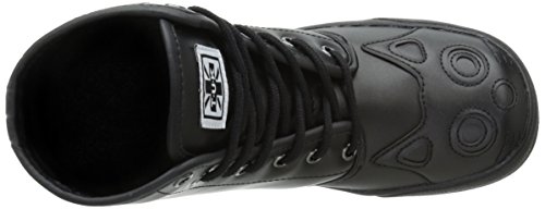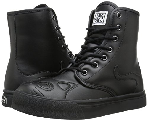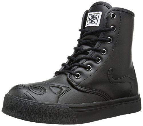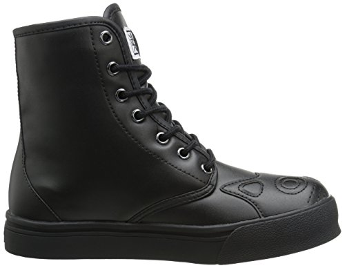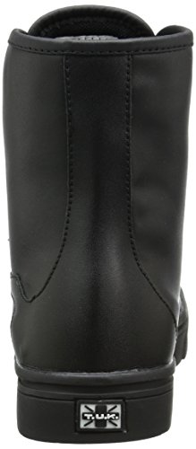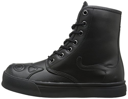 Whoever said all black cats are bad luck, didn't work at TUK! We love black cats! So much so, that we brought in a new style of popular kitty sneaker boot, in ALL black! This vegan hi-top sneaker has a black on black cat face with embroidered whiskers on the toe area and the kitty's black tail peek-a-boo's around the outer side from the heel area. Made of PU, this is a vegan friendly shoe with a 1" platform, a 7 eyelet lace up detailing and TUK signature skull and crossbones tread. Break superstitions and make new traditions with these lucky black cat shoes on your feet! Material: Synthetic.Feature