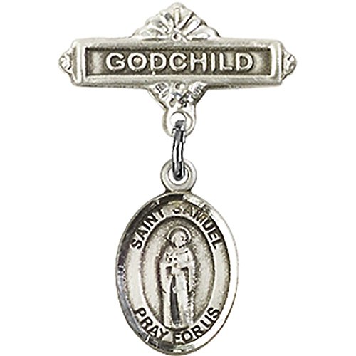 -. Title : Sterling Silver Baby Badge with St. Samuel Charm and Godchild Badge Pin 1 X 5/8 inches