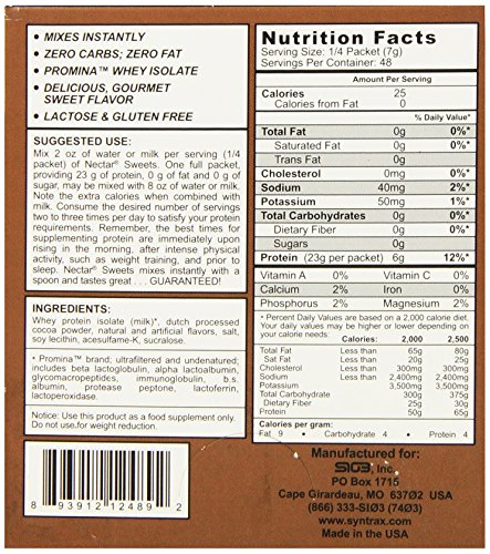 -. Binding : Health and Beauty -. Brand : Syntrax -. EAN : 0893912124892 -. Feature : 27 grams powder / Nectar grab n' go is considered to be the cleanest, most soluble and best tasting protein powder on the market / Nectar grab n' go contains the purest whey protein ever created -. IsAdultProduct : 0 -. Label : Syntrax -. Manufacturer : Syntrax -. MPN : SYNTGRAB0021CHOCPK -. NumberOfItems : 1 -. PackageQuantity : 1 -. PartNumber : SYNTGRAB0021CHOCPK -. ProductGroup : Health and Beauty -. ProductTypeName : HEALTH_PERSONAL_CARE -. PublicationDate : 2011-07-01 -. Publisher : Syntrax -. Size : 12 -. Studio : Syntrax -. Title : Syntrax Nectar Grab N' Go, Chocolate Truffle, 1-Ounce Pouches (Pack of 12) -. UPC : 893912124892