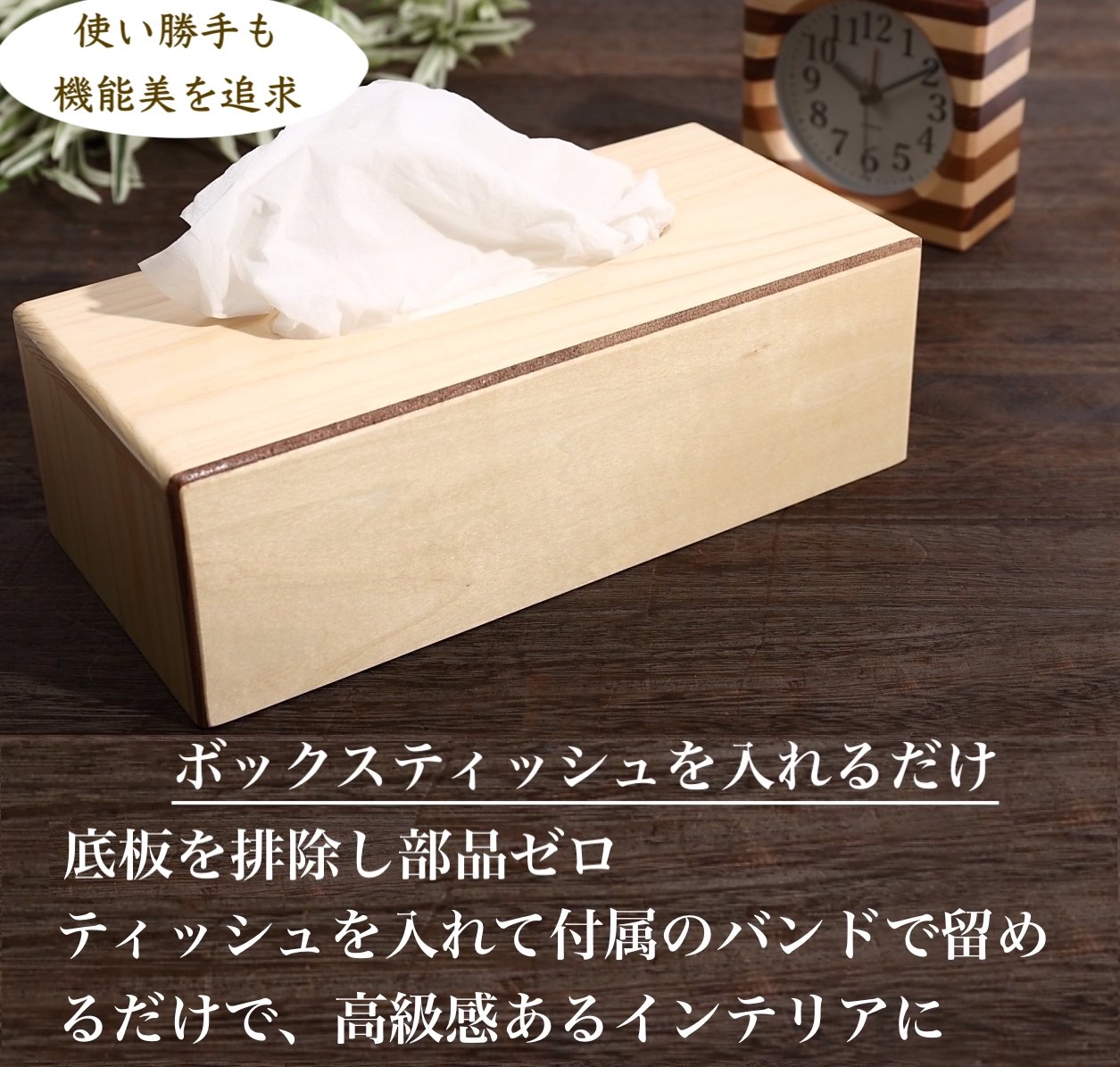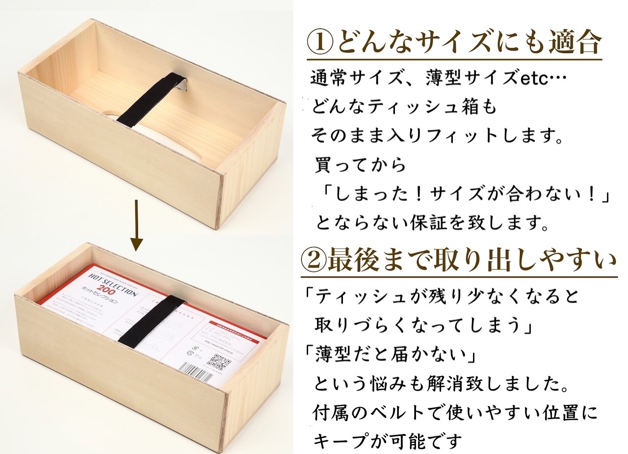 Match the wood grain dining table exactly. The method of fixing the tissue box with the Velcro tape is simple and very easy to use. It is made in such a size that the tissue box does not fall off even if it lifts. I'm looking forward to it.