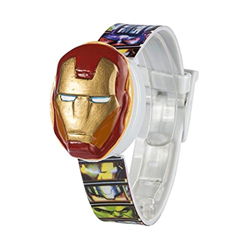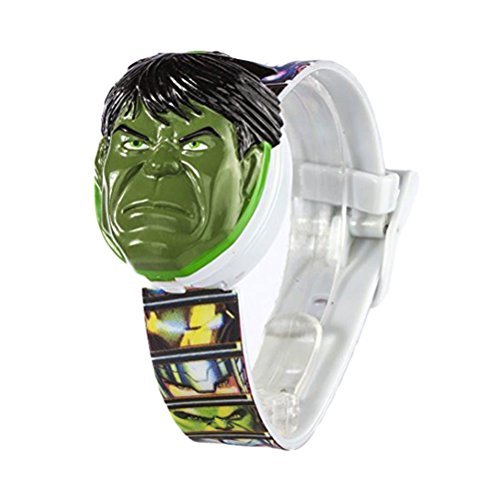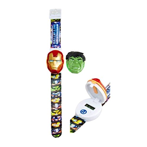 -. Feature : Lcd display / Printed strap / Easy to use buckle fastening. / Two interchangeable heads. / Heads hulk and iron man.