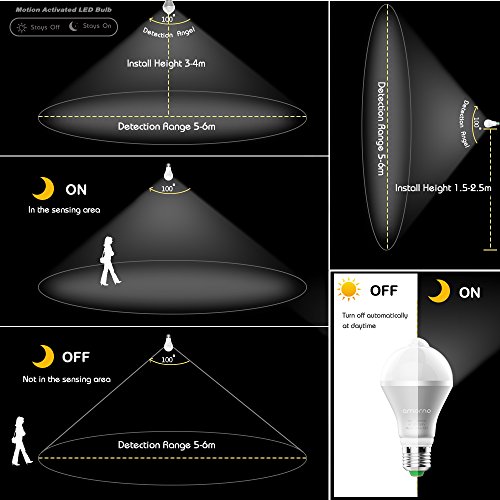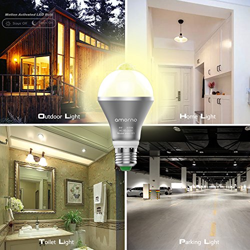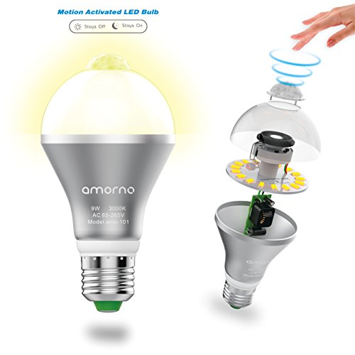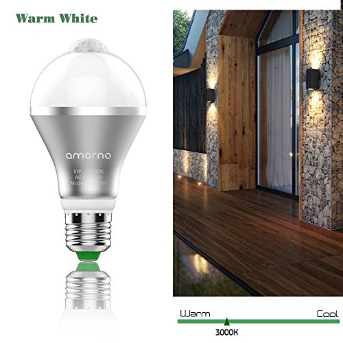 Motion Sensor Light Bulb,AMORNO 9W E26/E27 Smart PIR LED Light Bulb Auto on/off Night lights for Stairs,Garage,Corrido, Walkway,Yard ,Hallway,Patio, Carport (Warm White)