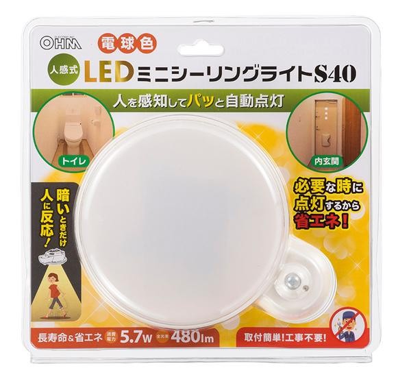 暗いときだけ人に反応して点灯するLEDミニシーリングライト。