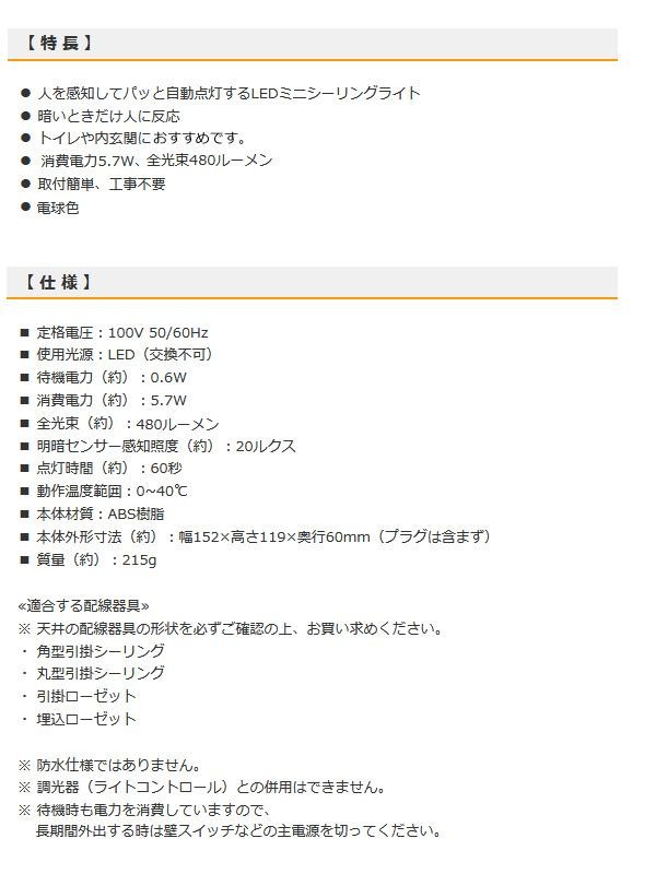 人を感知して自動点灯するLEDミニシーリングライトです。トイレや内玄関などにおすすめです。