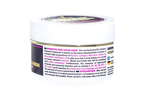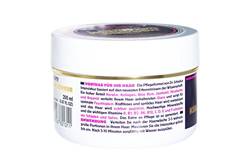 -. Feature : The care formula of Dr. Schedu's Intensive Treatment is based on the latest developments in science. It contains high proportions of Keratin, Collagen, Aloe Vera, Jojoba oil, Shea butter and Argan oil to give your hair a long lasting glow as well as ensure optimal moisture. / Weak and brittle hair will be revitalised and visibly smoothed. / Furthermore, the presence of high-quality minerals and essential vitamins such as vitamin A, B1, B2, B6, B12, C, D, E and F work together to protect hair from damage and split ends. / The extra bit of care is guaranteed. / Made in Germany!