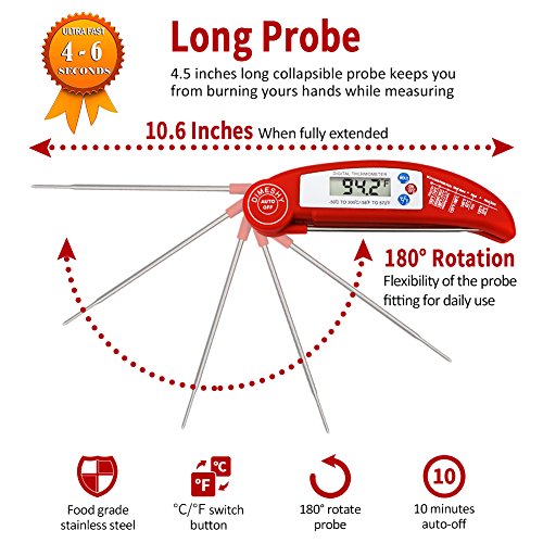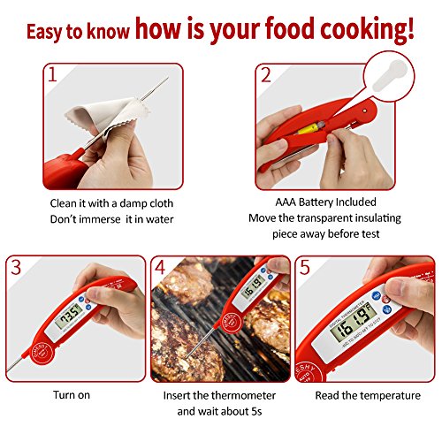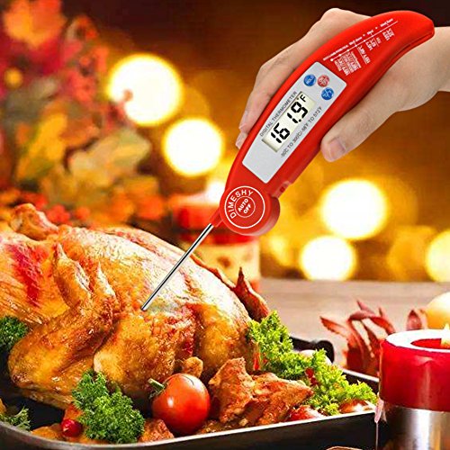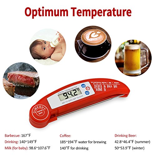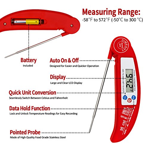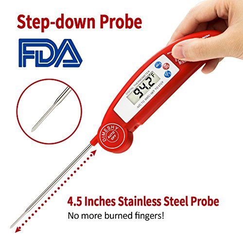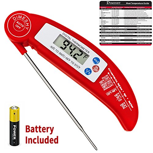 Studio : DIMESHY Publisher : DIMESHY Product Description High quality Food thermometer made of food grade stainless steel probe and ABS plastic casing, FDA Approved, it can used for many kinds of food. How to use? Very easy 1.Remove the insulating strip beside the battery. Dimeshy instant read meat thermometer including the battery, before use, open the back battery cap to remove the insulating strip, which make sure not lose the power from battery. 2.Open the probe and insert to food that you want to know the temperature. Waiting 4-6 second, the temperature will show on big LCD. BBQ Thermometer Features: - Fahrenheit/Celsius switchable - Response time: Fast Reading system temperature reading within 4 - 6 seconds -Measurement range:58℉ to 572℉(-50-300℃) -Accuracy: ± 1.8℉ (between -4℉ to 392℉) - Hold function, Instant Read thermometer With big LCD display easy to read - Food safety and cleanliness made by ABS plastic and stainless steel Foldaway probe - Battery power saving design Auto off Package included: 1 x Digital Food Thermometer 1 x AAA 1.5V Battery 1x Different food temperature chart Notices: 1.Clean the thermometer and probe with a damp cloth before and after use. 2.Do not submerse the unit in water or place it in dishwasher. 3.NEVER use the thermometer in a closed oven.