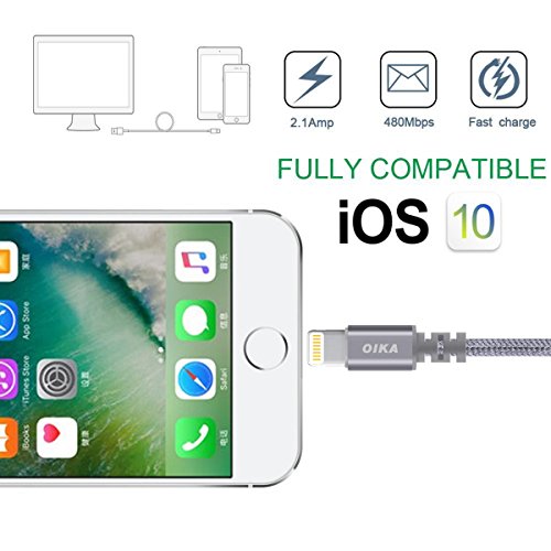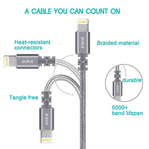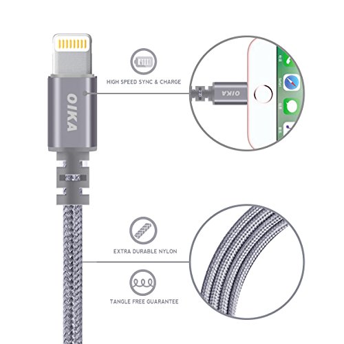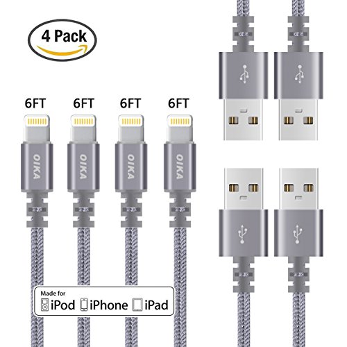 Lightning cable OIKA 4Pack 6FT Nylon Braided 8 pin IPhone Charger certified to charging Cable with charging indictor powerline for iPhone 5/5C/5S/6S/6S PLUS/7/7 plus, iPad Air, and more (Grey)