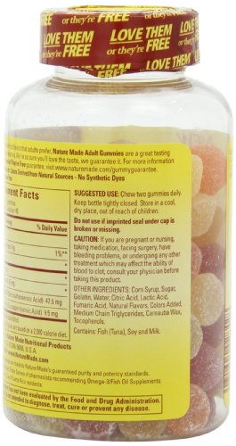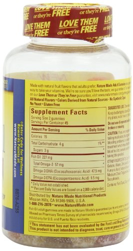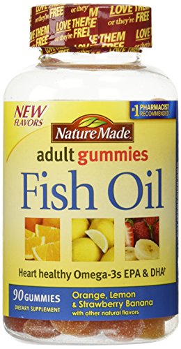 -. Binding : Health and Beauty -. Brand : Nature Made -. Feature : All natural fruit flavors -. Label : Nature Made -. Manufacturer : Nature Made -. ProductGroup : Health and Beauty -. ProductTypeName : HEALTH_PERSONAL_CARE -. Publisher : Nature Made -. Studio : Nature Made -. Title : Nature Made Fish Oil Adult Gummies, 90 Count