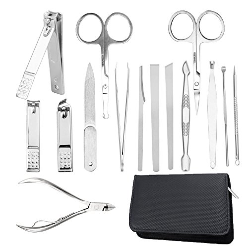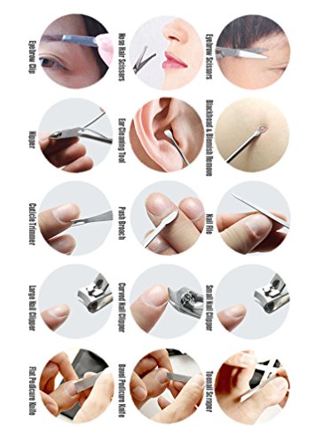 - PACKAGE INCLUDES - 3x Nail Clippers, 1x Eyebrow Scissors, 1x Nose Scissors, 1x Bevel Pedicure Knife, 1x Flat Pedicure Knife,1x Tweezers, 1x Ear Cleaning Tool, 1x Nail File, 1x Toenail Nippers, 1x Nail Cleaner, 1x Toenail Scraper, 1x Cuticle Trimmer and 1x Blackhead & Blemish Remove.