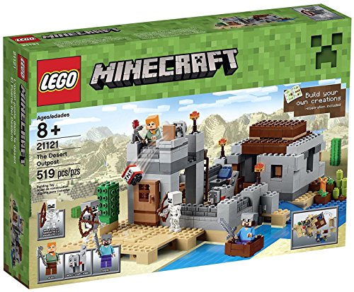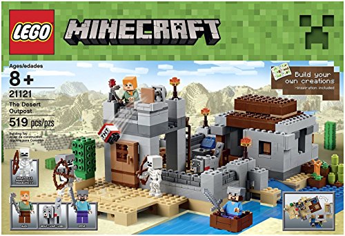 -. Binding : Toy -. Brand : -. EAN : 0673419233637 -. Edition : 1st -. Feature : Weapon elements include a sword, 2 skeleton bows and a pickaxe. / Accessory elements include skeleton's armor; includes 519 assorted pieces; set your imagination free / Experience The Desert Outpost; sail out in search of supplies!; launch the TNT to defeat the skeleton army / The perfect gift for fans of building and Minecraft; rebuild for more Minecraft creations / Measures 4" (11cm) high, 10" (27cm) wide and 13" (34cm) deep -. Genre : strategy -. IsAdultProduct : 0 -. ItemPartNumber : 6102226 -. Label : -. Manufacturer : -. Model : 6102226 -. MPN : 6102226 -. PackageQuantity : 1 -. PartNumber : 6102226 -. ProductGroup : Toy -. ProductTypeName : TOYS_AND_GAMES -. Publisher : -. ReleaseDate : 2015-08-01 -. Studio : -. Title : Minecraft 21121 the Desert Outpost Building Kit -. UPC : 673419233637 -. Warranty : No Warranty