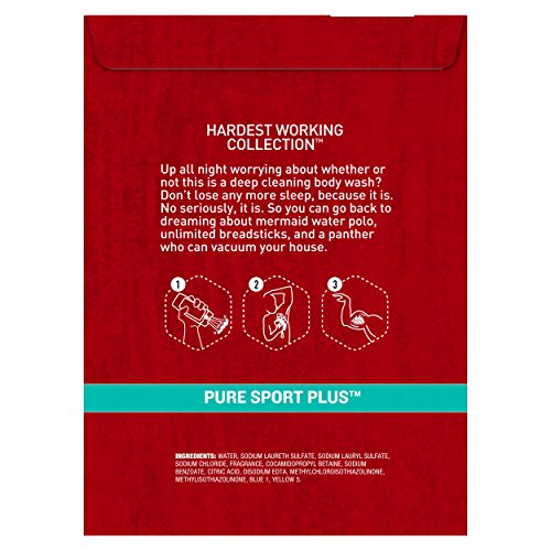Pure sport plus what? nachos? karaoke? laser gloves? hover pants? I guess we'll never know. Because everyone who applies the hardest working collection body wash to his body forgets all about dirt and becomes far too successful to return our calls. Are you up all night worrying about whether or not this is a deep-cleaning body wash? don't lose any more sleep, because it is. No seriously, it is. So you can go back to dreaming about mermaid water polo, unlimited breadsticks, and a panther who can vacuum your house.Feature