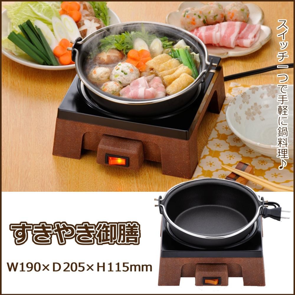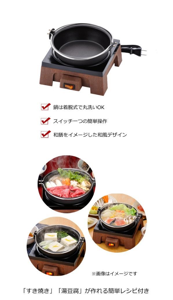 | すき焼きや湯豆腐が作れる、コンパクトタイプの電気グリル鍋です。スイッチ一つで「ON」「OFF」できる簡単操作。鍋は完全着脱式で丸洗いOK。鍋内面にはフッ素樹脂加工を施してあり、お手入れも簡単です。すき焼き・湯豆腐が作れる、かんたんレシピ付き♪ |