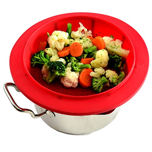 Steaming; a healthy way to cook! This steamer sits on top of your pot so you can cook below and steam above! Ideal for steaming fish, vegetables, dumplings, dim sum. Save time: boil your potatoes or pasta while steaming your vegetables. Steaming enhances natural flavors while retaining valuable vitamins and nutrients. Steamed foods are self-basting, so moisture is retained. Clean, quick and economical method of cooking. Use to warm up leftovers. Silicone is FDA approved, food safe, high heat resistant to 480 Degree F/250 Degree C. Easy to grab outer rim; nonstick and won't scratch pots and pans. 10.75"/27cm diameter, 2"/5cm deep, fits 8"/20cm diameter pot.Feature