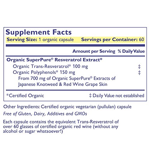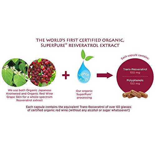 -. Feature : First certified Organic SuperPure Resveratrol of its kind / 100 mg of Trans-Resveratrol derived from organic Japanese knotweed and organic red wine grape skins / Discover the proven longevity and healthy aging effects of Resveratrol / Promotes healthy, radiant skin and nourishes overall well-being / Certified Organic and Kosher, Gluten-Free, Non-GMO, Vegan, Allergen Free