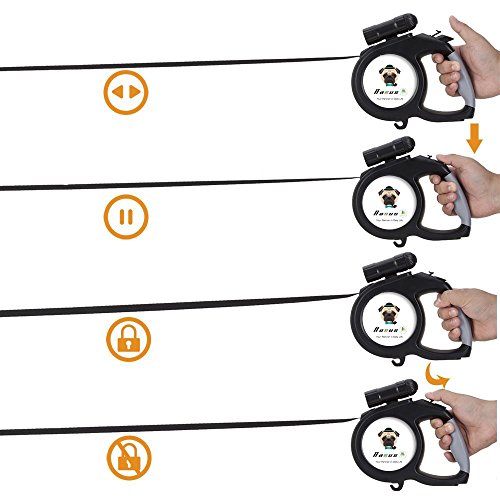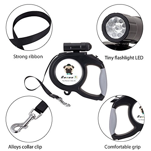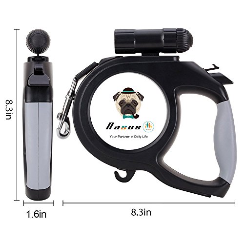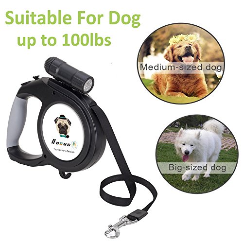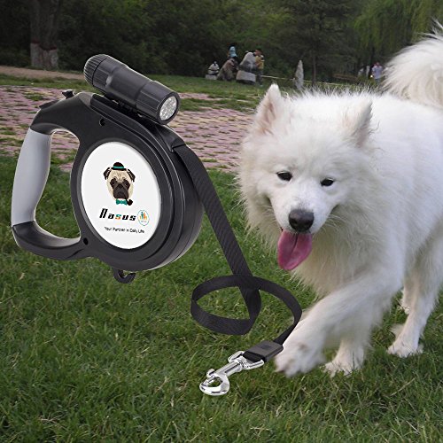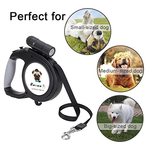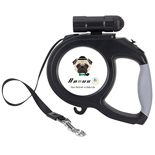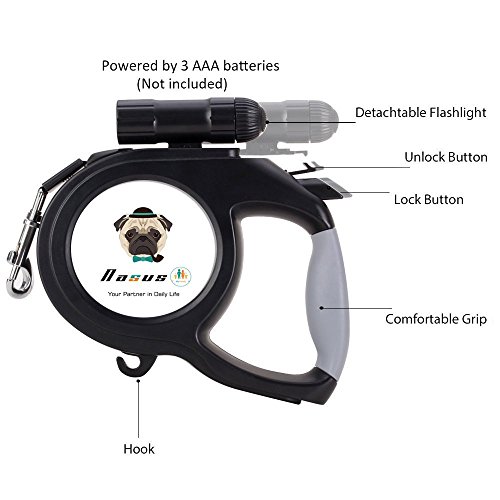 Outstanding features of the Nasus Retractable Dog Leash: High quality The retractable leash adapts corrosion resistant ABS TPE plastic and sturdy polyester ribbon and scrupulous details disposal, and ergonomic handle grip design fit hands better when handing it. Flexible and smooth extending and contracting function An internal stainless steel mechanism included makes it flex smoothly and noiselessly, which could prevent it from stuck, and the length of the tape can be optionally adjusted as you like to control the acting range of the pets and prevent hurting by tape. Better safety assurance An extra 9 LED detachable flashlight is added to track conveniently when walking dogs at night so that the pets are in the line of sights at any time, which could give a better safety.