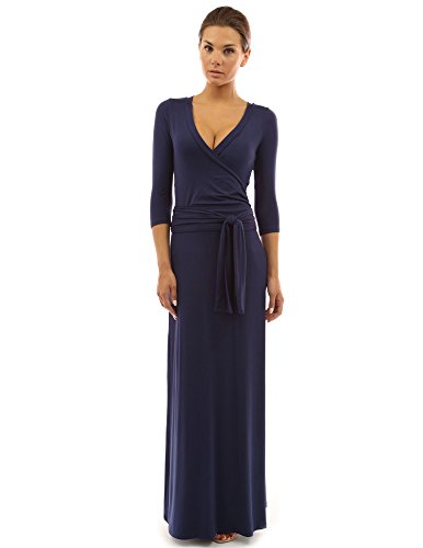 3/4 Elbow Sleeve Crossover V Neck Faux Wrap Belt Stretch Maxi Dress. Model in pictures is 5 feet 8 inches (173cm) tall wearing a pair of 3 inches high heels.