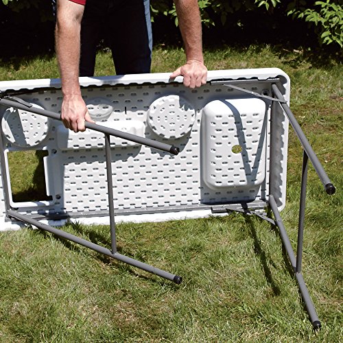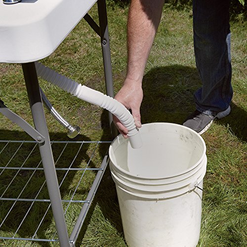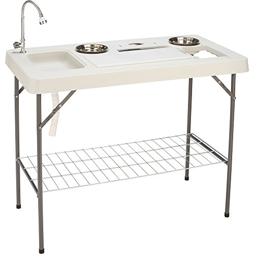 Studio : Kotulas Publisher : Kotulas Product Description This deluxe flex fish cleaning camp table with flexible faucet and accessories is portable and easy to move and set up, so you can clean your catches without mess or hassle. Plus, it's great for tailgating or backyard parties. It features a flexible sprayer faucet that hooks up to a standard garden hose to provide fresh water and allows you to empty the sink into a bucket or floor drain to minimize cleanup. Legs lock in both the folded and upright positions. Accessories include 2 bowls, fillet knife, odor removing bar, cutting board, wire shelf and trash bag holder. Table is 50in.L x 25 1/2in.W x 37in.H when upright and 50in.L x 25 1/2in.W x 4in.H when folded. 0