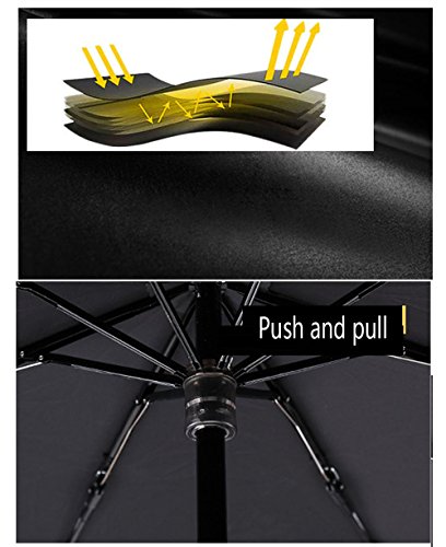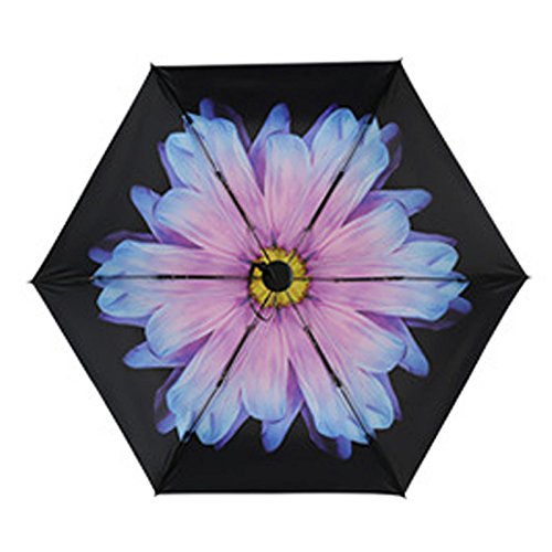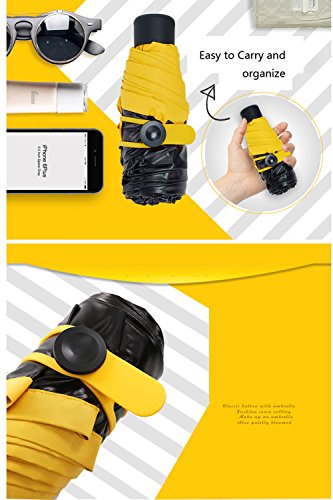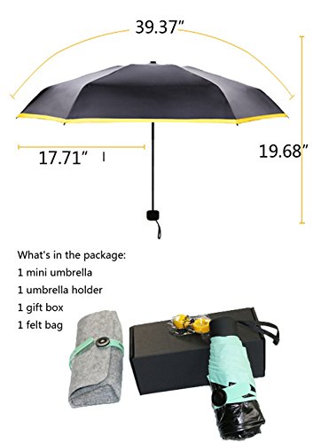 -. Feature : ►EASY TO CARRY: With only 195 g / 0.43 lbs. in weight, Foldable to 6.69 inch this ultra light-weight umbrella easy to carry and fits in a purse, small backpack and most handbags. / ►UV PROTECTION: UPF>50; AV<5% - This sun umbrella can fully blocks heat and harsh UV rays with intensive black vinyl coating; you'll feel cooler in the hot sun, also skim protection. / ►WATERPROOF & WINDPROOF:Effective rain-repelling fabric ensures raindrops slide off the umbrella rapidly without leaking through even in harsh pouring rain. This premium canopy makes it stronger in the wind. / ►FINGER PROTECTION: Open/close umbrella by directly pushing/pulling the runner without a button. Safer and smoother than common design! / ►A GOOD PARTNER: This pocket umbrella is really an essential for anyone on the go; it is helpful both in the sunny and raining day, why not surprise your loved one as a gift.