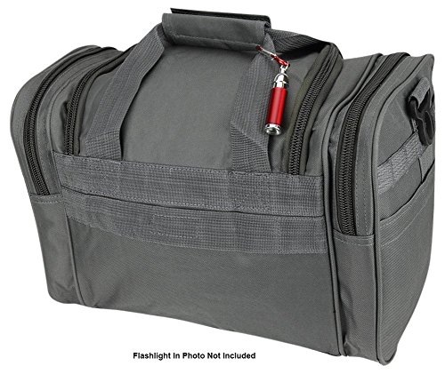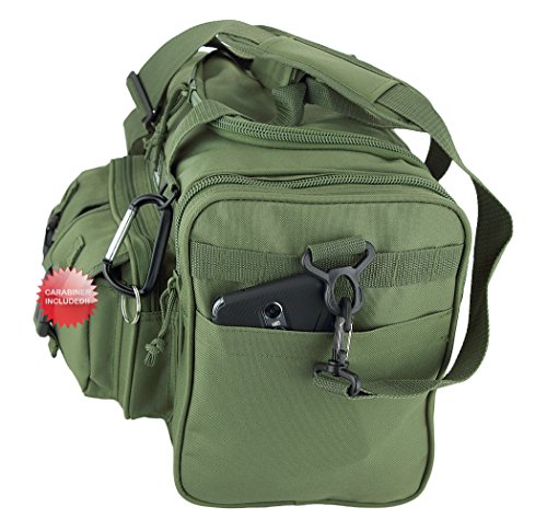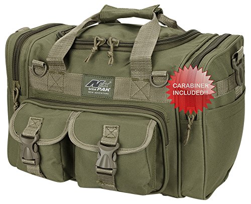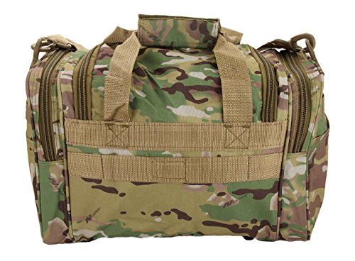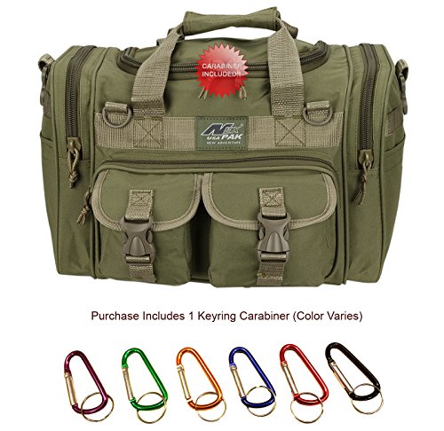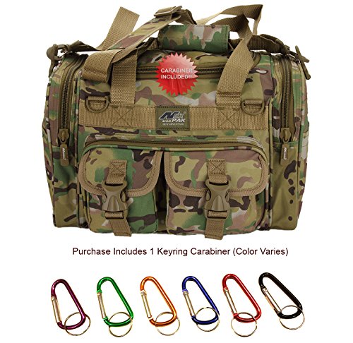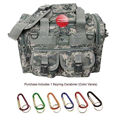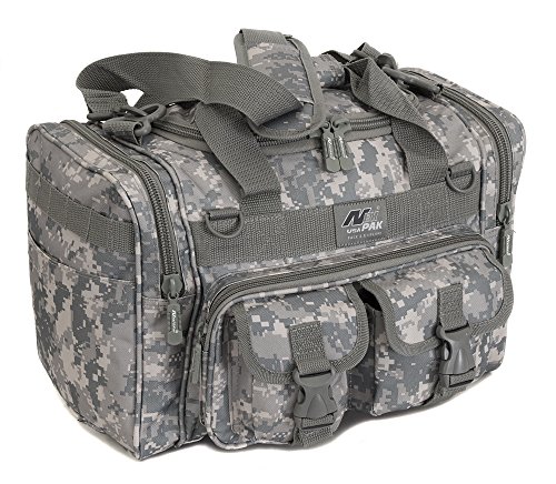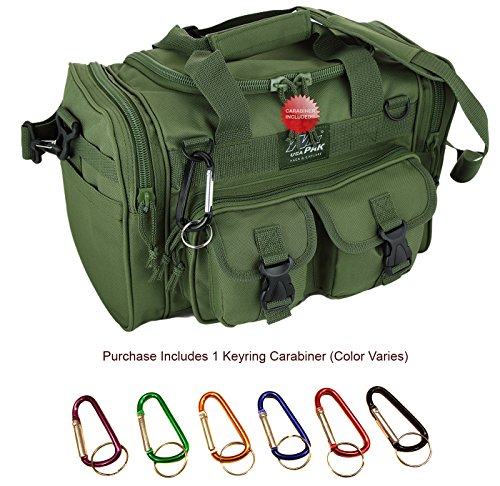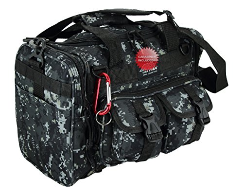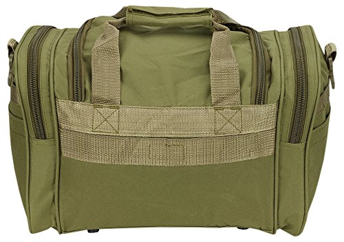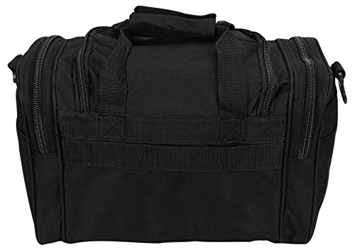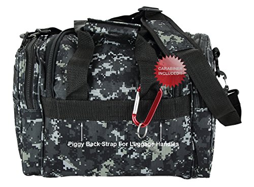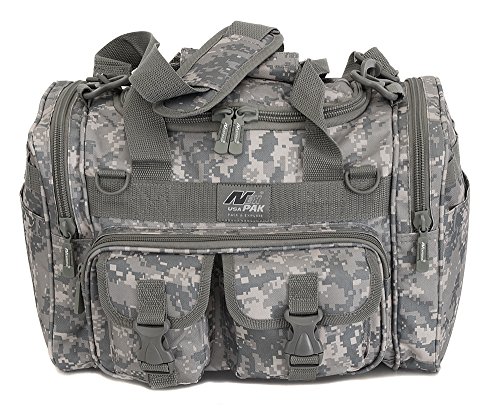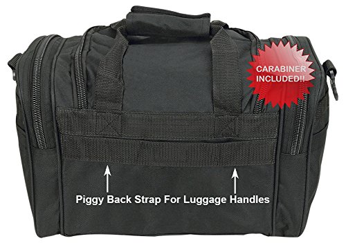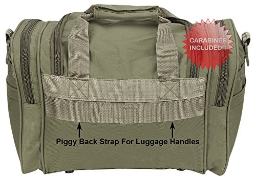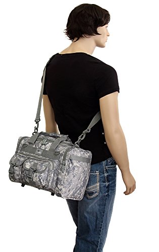 INCLUDED : Key ring with carabiner (color varies) This mens womens small duffel bag is ideal for military, tactical assault gear, cargo, hiking, camping, hunting, sports and gym, carry on, and more. It is constructed of high density polyester that provides durability and longevity under daily use. The pockets are lined with PVC that provide water repelling protection from the elements, so your gear stays dry in wet weather. Storage is a big advantage with this tactical duffle. It has 2 front adjustable buckle snap flap pockets (4.5L x 4W) (5L x 4W), and 1 long zippered front pocket (10L x 6) Both side panels consist of a large zippered pocket (10L x 9W), a velcro closing pocket (7.75L x 6.5W) and Molle strap system which allows attachments of military type tactical pouches and other accessories. The front also has 2 D rings for attaching accessories. The main compartment (12.5L x 9W x 8D) features a U-shaped dual zipper opening with PVC interior lining to protect your things from the elements such as water. Also comes with a PVC-lined floor board to stiffen the bottom side. Luggage Friendly Piggy-back rear strap for attaching on to luggage carts 2 carry handles have a velcro wrap-around strap to form one main handle for easier handling. Removable and adjustable shoulder strap comes with sliding shoulder pad and extends up to 43.5 inches which allows for your own perfect fit Dual zipper access on main compartment only. Available color options: Black, ACU Digital Camo, ACU Navy Digital Camo, Tan, OD Green, Gray, Hunters Camo, Hunters Camo Pink Get yours today while supplies last! 0 |