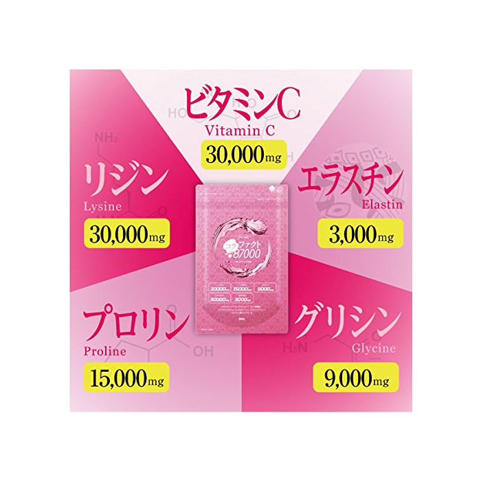 원재료:전분,엘라스틴 펩티드(어유래)/비타민C,L-lysine 염산염,《히도로키시푸로피루메치루세루》로스,L-프로 ring,글리신,스테아린산 칼슘,미립2산화 규소,착색료(카라멜,2산화 티타늄(티탄))