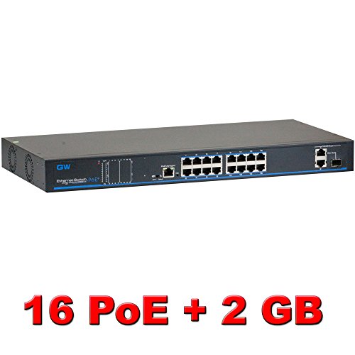 GW Security GWSW1602G 10/100Mbps Desktop/Rackmount 16 Port PoE Switch, Max 30W each POE port, 2 Uplink ports and 2 Gigabit Fiber Optical SFP ports, Up to 820FT Transmission Distance