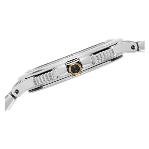 Classic styling with elegant detailing, the Seiko Men's Le Grand Sport Two-Tone Watch features a stainless steel case and a two-tone stainless steel band with gold-tone highlights. For added style and color contrast, this timepiece comes with polished gold-tone hour markers and hands, and a gold-tone and black cabochon crown. The watch's attractive patterned dial features a date window at the three o'clock position and comes protected by a scratch-resistant sapphire crystal. Other features include a band that closes with a deployment buckle, reliable Japanese quartz movement, and water resistance to 165 feet (50 meters).Feature