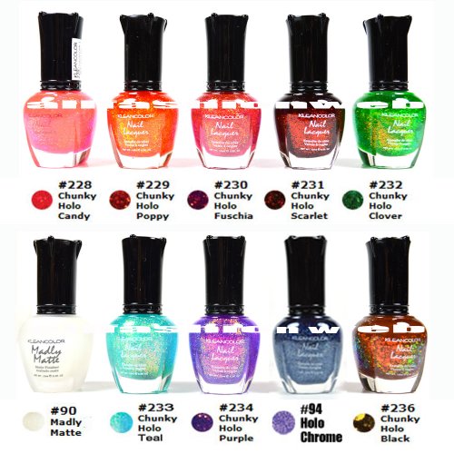 Trend-setting shades with a top-quality formula long-lasting, chip-resistant nail lacquer. 10 Different Colors : #228 Chunky Holo Candy, #229 Chunky Holo Poppy, #230 Chunky Holo Fuschia, #231 Chunky Holo Scarlet, #232 Chunky Holo Clover, #90 MADLY MATTE, #233 Chunky Holo Teal, #234 Chunky Holo Purple, #94 Holo Chrome, #236 Chunky Holo BlackFeature