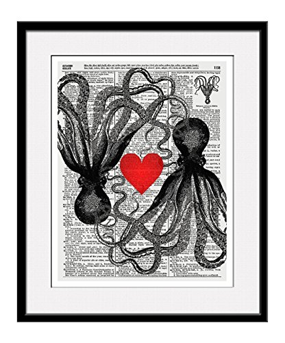 The 11x14 inch "Octopus Love" art print is a reproduction of an antique dictionary page from the early 1900's. The page that was used for this reproduction print has the definition of the word "Octopus" on it, along with a small vintage dictionary image of an octopus. After many requests, Vintage Book Art now offers these truly unique reproduction prints in larger sizes than our traditional dictionary prints. All 11x14 inch prints do NOT come framed and are shipped rolled inside a protective plastic sleeve, a shipped tube, then within a box for added protection. These prints look amazing in any room of your home and also make wonderful one of a kind gifts.