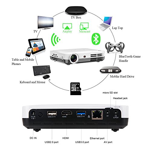 Good Choice for office Projector & Home video projector : 250 ANSI(2000 lumens), 1280x800 native resolution, DLP Technology, supports 3D/2D to 3D video conversion and support 1080P, LED lamp, amazing 3D effect. Built-in WIFI(2.4G/5.0GHz), Bluetooth 4.0 and and Touch Control.
