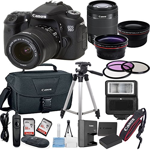 Canon EOS 70D Digital SLR Camera with EF-S 18-55mm IS STM Lens Bundle includes Camera, Lenses, Filters, Bag, Memory Cards, Tripod, Flash, Remote Shutter and More - International Version