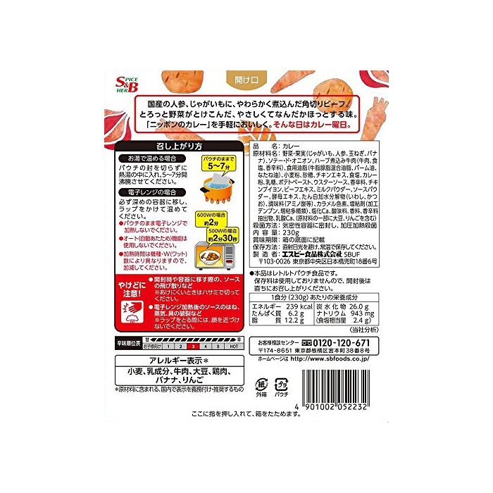 원재료:야채 과실(옥파,감자,(당근)인삼,바나나)고, 쇠고기,식용유지(팜유,콘유,대두유,이군요 유,미강유)고, 소맥분,설탕,치킨 bouillon,식염,카레분,유당,우스타 소스,향신료,사과 과즙,수 엿,비프 엑기스,밀크 파우더,소스 파우더,효모 엑기스,단백 가수분해물(정어리,가다랭이)고, 카라멜 색소,조미료(아미노산등)고, 인산염(Na)고, 신맛료,증점다당류,향료,유산Ca,(그 외 젤라틴 유래 원재료를 포함한다)