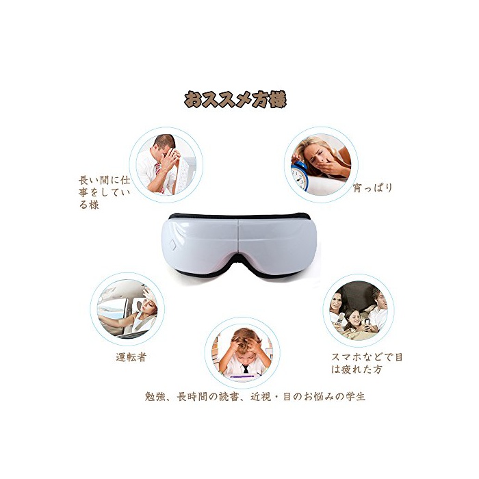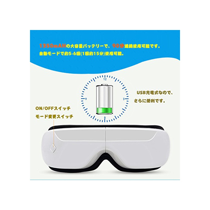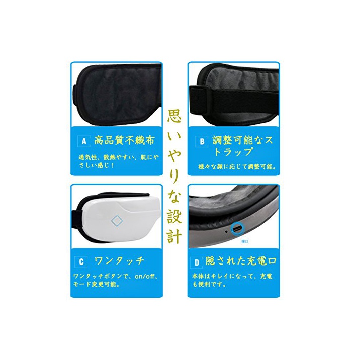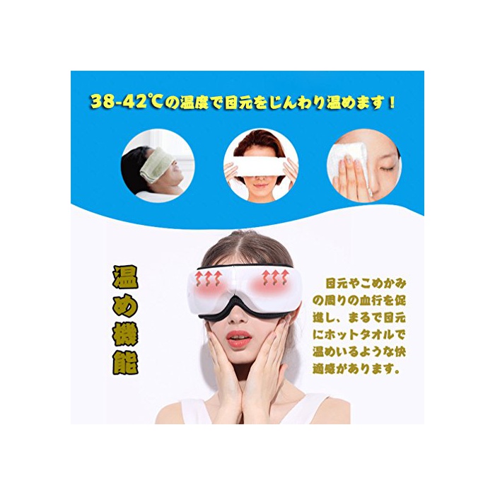 기분이 상쾌하다「에어 따뜻하게 진동」기능으로,친절해(눈가)눈매를 케어 하는(눈매)눈가안마기입니다.따뜻하게 기능으로 38-42℃의 온도에서(눈매)눈가를 하지 않겠 비 따뜻하겝니다.(눈매)눈가주위의 혈행 촉진,안정피로 해소,기질세포를 활성화 합니다.눈(째)를 친절하게 자극해 피류를 개선 하고, 눈(째)의 피로를 가라앉혀 줍니다.