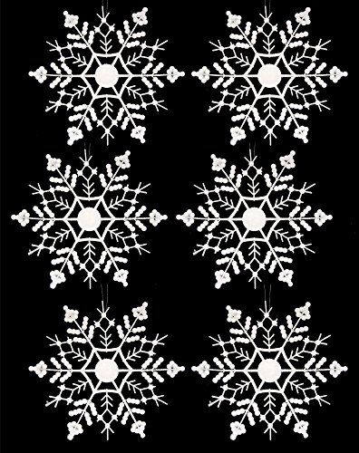- Feature : Set of 6 snowflake ornament decorations / White Glitter Finish Shimmer and sparkle / Each snowflake measures 6.5" Diameter / Comes with loop of string for easy hanging / Perfect to decorate a winter theme birthday party for girls. Hang from the Christmas tree, from the window or from the ceiling and doorways. Hang from different lengths for a more dramatic effect.