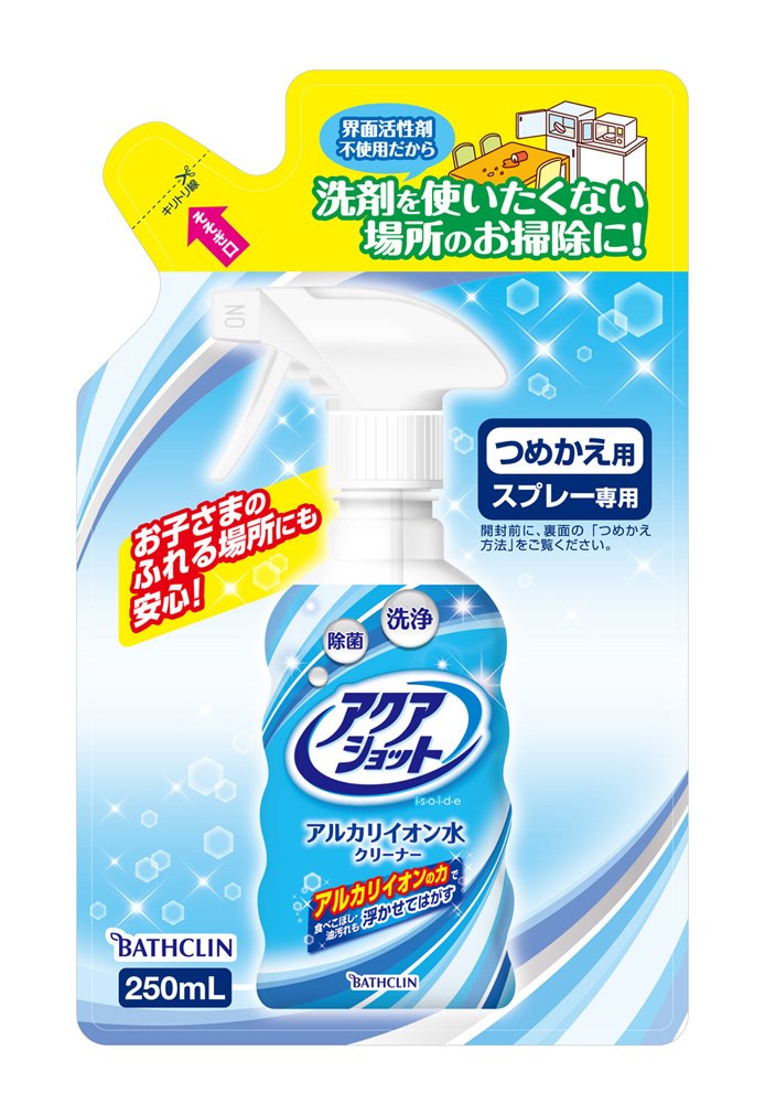 "Baskin kitchen aqua shot i · s · o · i · d · e refilling 250 ml" is a refill of quick cleaner of alkaline electrolyzed water friendly to people and environment.