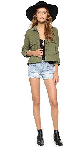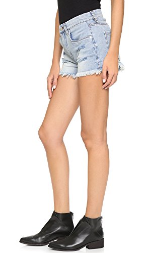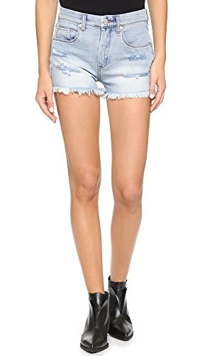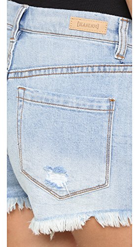 Distressed Blank Denim shorts with shredded holes and a frayed hem. 5-pocket styling. Single-button closure and zip fly.