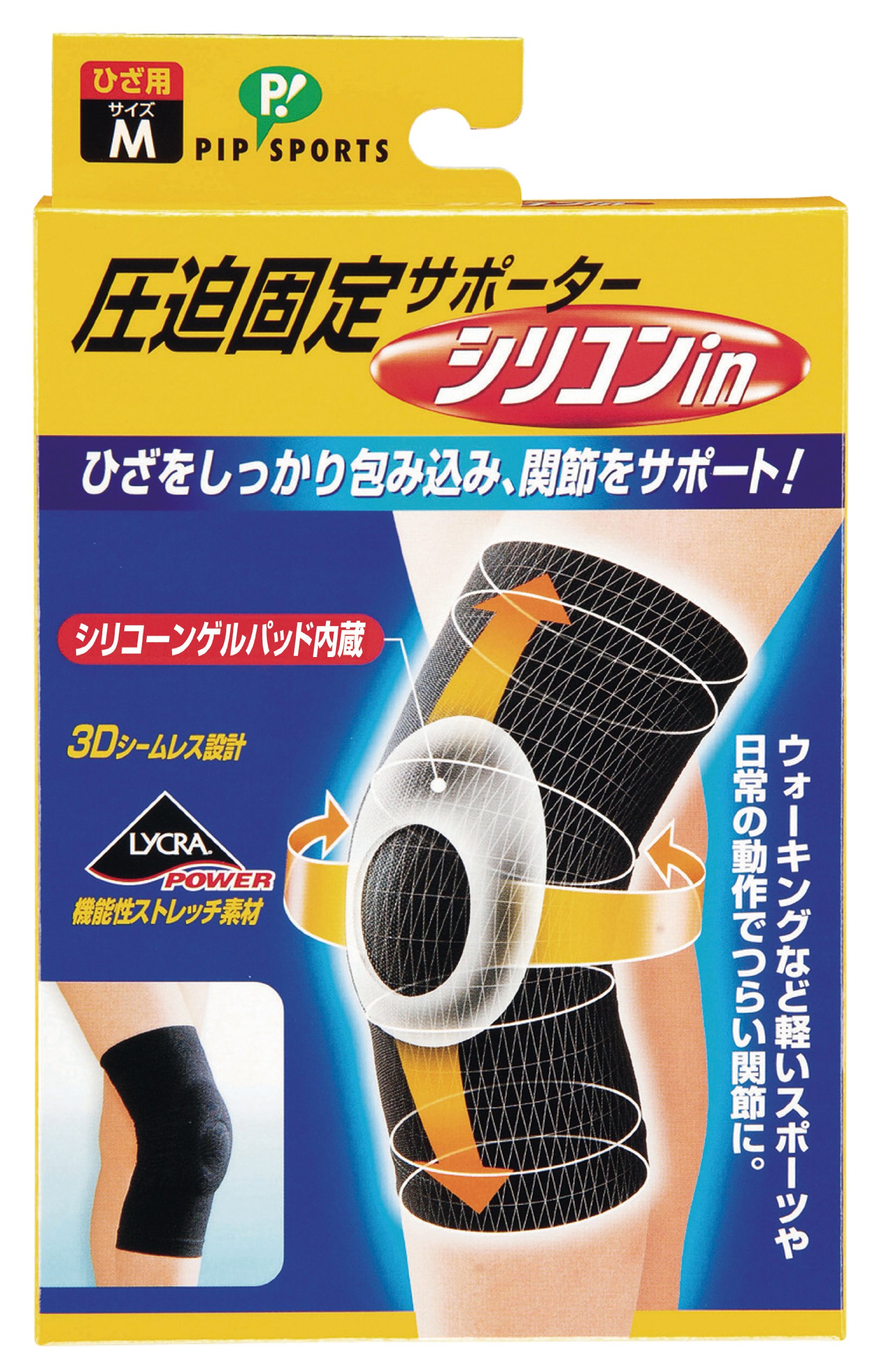 "Compression fixation supporter silicon in knee (knee) M" is a supporter for knees with a built-in silicone gel pad.