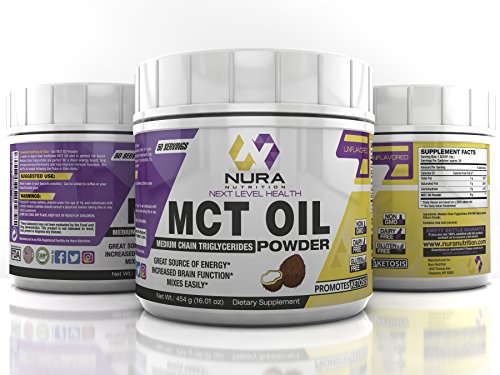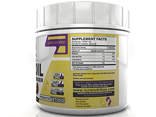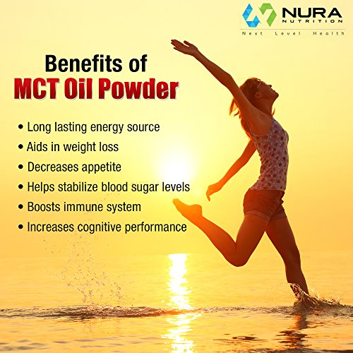 -. Feature : 100% Money back guarantee!!! At Nura Nutrition, customer satisfaction is our number one P.R.Iority. If you are unsatisfied with your purchase, for any reason, contact us to receive a full refund. All of our products are backed by a 100% money back guarantee. / CONVENIENT, EASY TO CONSUME: We provide an MCT oil powder that is 55% C8 and 45% C10. This combination of medium chain triglycerides is perfect for long lasting energy. It is also made from coconuts, as opposed to palm, and is 100% GMO free. If you love the benefits of MCT oil but don't want to deal with the mess of using it, especially while you travel, then our MCT oil powder is exactly what you're looking for. rade MCT oil powder easily mixes with food and beverages to add a s / HIGHEST QUALITY: Our easy to digest MCT oil powder is manufactured in a GMP certified facility to ensure the highest quality. Each batch of MCT oil powder goes through a stringent quality testing process for impurities before being shipped to make sure you are getting the best MCT oil powder on the market. / KETO AND PALEO FRIENDLY: MCT's are a great source of energy as our body can access multi chain triglycerides quickly to be used as a powerful, convenient fuel source. Our MCT oil powder is perfect for people on the Keto or Paleo Diets. / STAY HEALTHY & ENERGETIC: If you are looking for the easiest way to add more healthy fats to your diet then you JUST found it! This pure MCT oil powder has 7 grams of fat per serving and helps to decrease appetite and leave you feeling full longer.