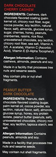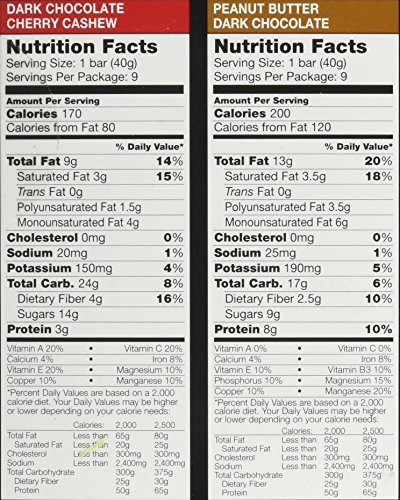 This bars are made with tasty ingredients you can see and pronounce, like nuts, fruits, honey and spices. Mysteries belong in novels, not in your food. Variety pack include: 9 peanut butter dark chocolate plus protein and 9 dark chocolate cherry cashew plus antioxidants bars.Feature