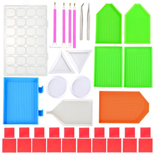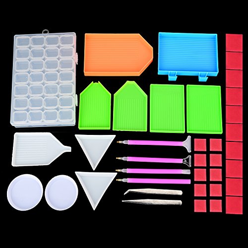 - Package include: 11 pieces plastic plates( include 7 types ),4 pieces different types of diamond stitch pen, 2 pieces of different tweezers, one plastic adjustable 28 slots boxes 20 pieces of different size of clay ( include 10 pieces 2*2 cm and 10 pieces 3*3 cm ).