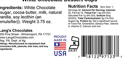 -. Binding : Misc. -. Brand : Lang's Chocolates -. Feature : Made in small batches to ensure highest quality / Kosher Certified Chocolate / Perfect for a gift, snack, or just a way to say thank you / 32 white chocolate dessert cups measuring 28mm x 27mm, 1 inch by 1 inch / empty shells waiting to be filled with your creation -. Label : Lang's Chocolates -. Manufacturer : Lang's Chocolates -. PackageQuantity : 32 -. ProductGroup : Grocery -. ProductTypeName : GROCERY -. Publisher : Lang's Chocolates -. Studio : Lang's Chocolates -. Title : 32 White Chocolate Dessert Cups Certified Kosher-dairy