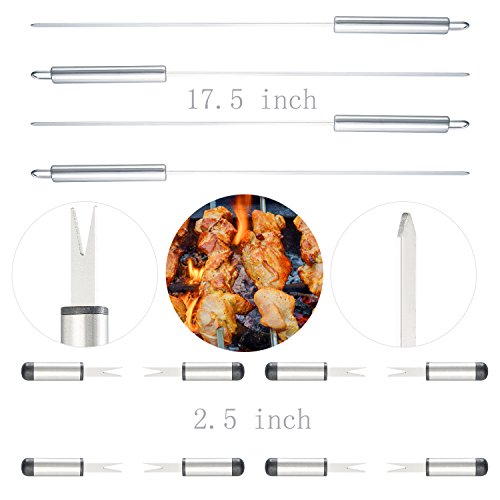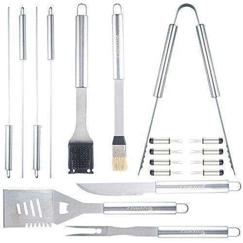 - WHAT YOU GET - Spatula, tongs, large knife, large fork, wire brush, basting brush, 8 pieces corn holders, 4 pieces skewers, aluminum case. With all these tools, there’s no need to purchase additional pieces or worry about not having the right tool for the job