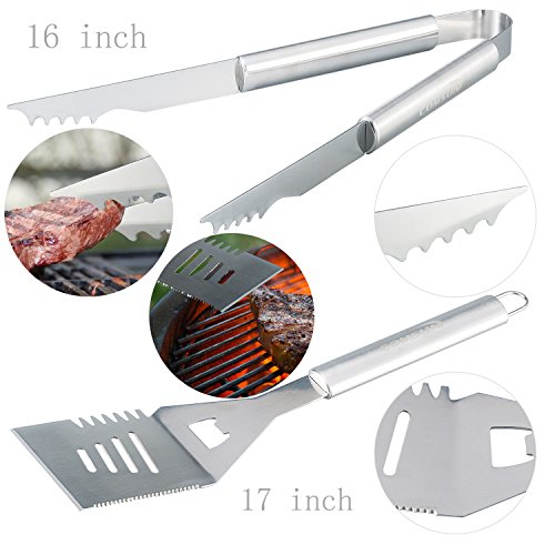 - FUNCTIONAL - Spatula is designed with a handy bottle opener and serrated edges for easy cutting. Tongs have serrated edges to grab hot dogs and sausages easily. Basting brush for delicious BBQ and wire brush for cleaning. Matching corn holders for corn on the cob
