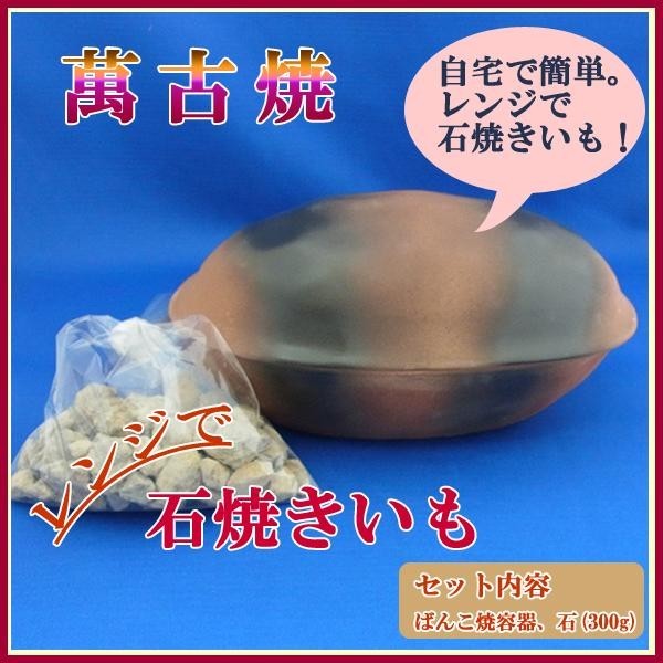 | 萬古(ばんこ)焼の容器に、鈴鹿山脈で採取し、熱処理した石が300gついています。本体に敷き詰めて芋を置けば準備OK。電子レンジを使って手軽に石焼き芋を作れます。サツマイモのほかに、とうもろこしやジャガイモなどでもお使いいただけます!! |
