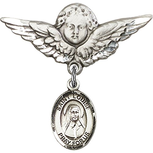 -. Title : Sterling Silver Baby Badge with St. Louise de Marillac Charm and Angel w/Wings Badge Pin 1 1/8 X 1 1/8 inches