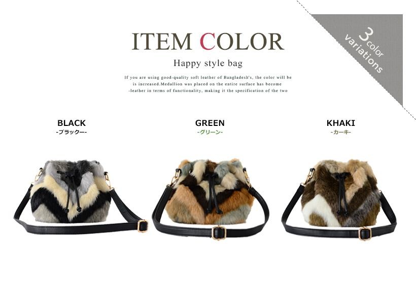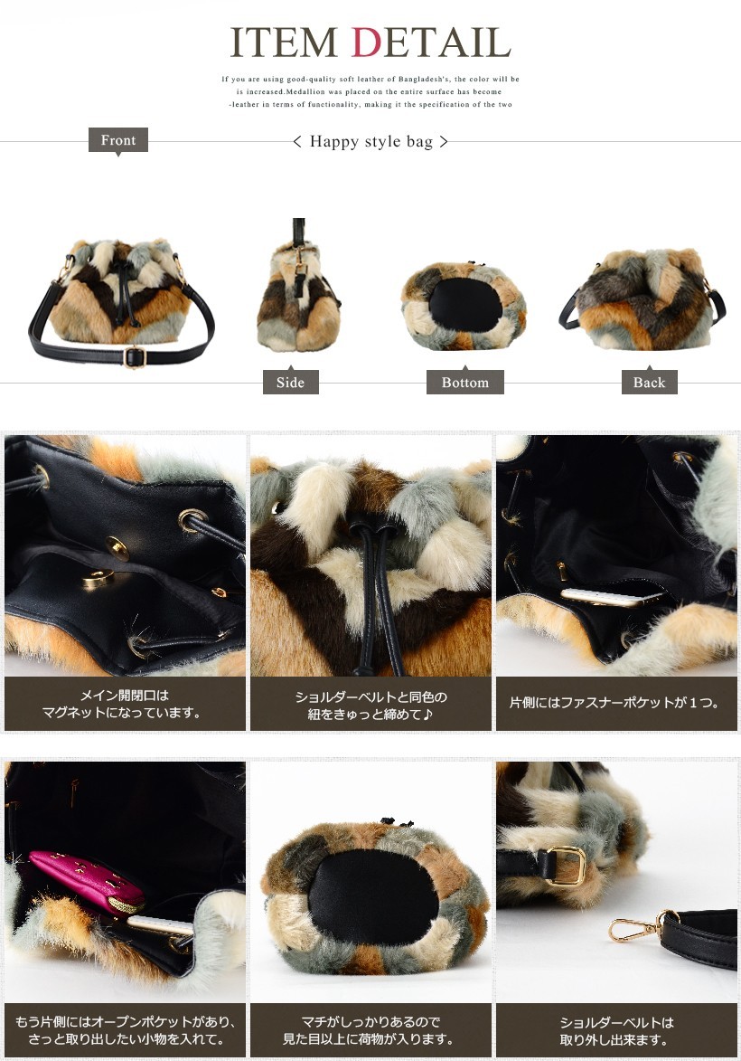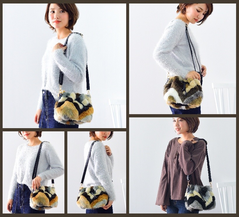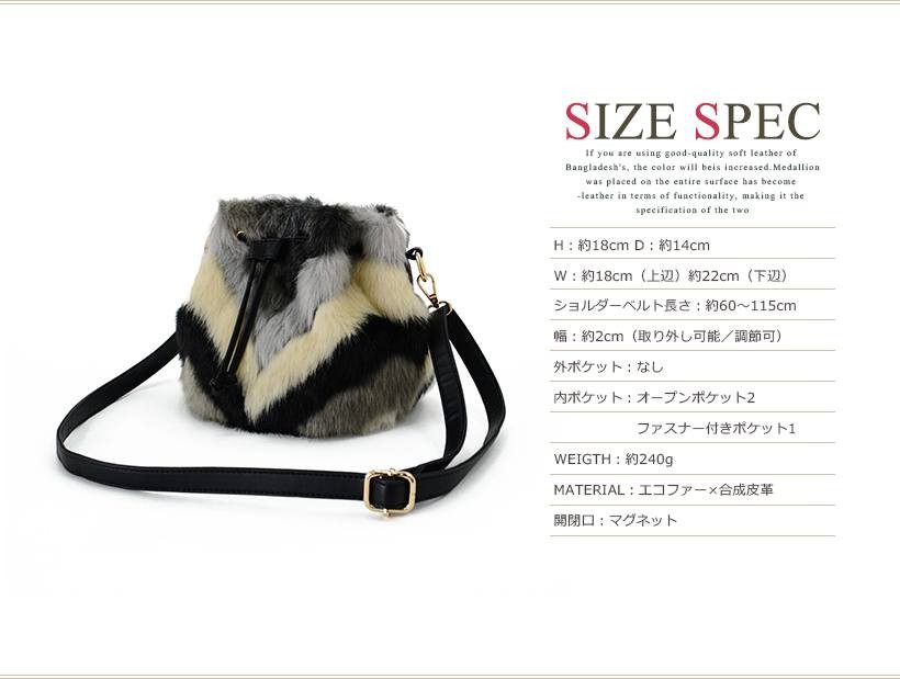 ミックスカラーのエコファーを使用したミニバッグ。4~5色のファーで出来た波模様が遊び心のあるデザインに、トレンド感をおさえたオシャレバッグ。ジグザグ模様とコロンとした丸みのあるフォルムがが女性らしさを引き立ててくれます。●SIZE:高さ:約18cm / 幅:約18cm(上辺)約22cm(下辺)/ マチ:約14cm●ショルダーベルト長さ:約60~115cm×幅:約2cm(取り外し可能/調節可●外ポケット:なし●内ポケット:オープンポケット2、ファスナー付きポケット1●重さ:約240g●素材:エコファー×合成皮革●バッグのメイン開閉口はマグネットになっております。[カラー]ブラック・グリーン・カーキメーカーより取り寄せ商品のため、在庫状況によっては欠品・廃盤の可能性があります。あらかじめご了承ください。