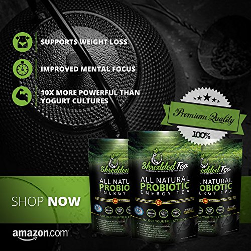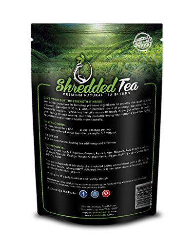 -. Feature : 1 BILLION CFU PROBIOTICS SURVIVING 10X BETTER - Our unique, patented strain of probiotic is naturally resilient delivering live cells 10x more effectively than yogurt cultures helping restore and fortify the good bacteria found in your gut; all to help purge excess water and toxins to reduce bloating and discomfort. / HEALTHY, NATURAL DETOX - Packed with natural ingredients like Ginseng Root and Green Tea, our probiotic tea helps rid your digestive system of toxins to help boost your immune system, metabolism and ability for natural fat burning. / SUPPORTS WEIGHT LOSS - Perfect for supporting both traditional diets and exercise, Shredded Tea helps increase your natural energy with thermogenesis to give you more strength and stamina while reaching your fat loss goals. / IMPROVED MENTAL FOCUS - By ridding your body of these excess pollutants and increasing your natural energy, you'll find that your maintain healthier focus, awareness and mental clarity, not to mention more positive feelings. / SATISFACTION GUARANTEE - Shredded Tea was created to be the best energy tea available today for improving your natural health and wellness. However, if you aren't happy with our product, let us know within 30 days for a full refund.