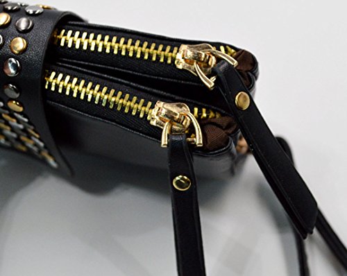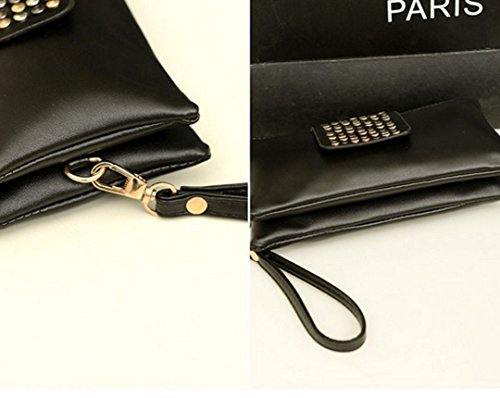 -. Feature : Material: PU leather + polyester lining + rivets / Purse Dimension: 20*2*10cm/7.9*0.8*3.9in, small evening clutch / Rivets studded in the small flap, Gold-tone hardware, Folded Messenger Bag Style with zipper closure for better convenience, trendy, low key and classy / Neat & Spacious Division: 2 large zipper compartments for makeup, cell phone, small wallet, etc; 3 special pouches with several slots in each compartment for credit cards / Versatile Clutch Purse / Wristlet Handbag / Zipper Wallet Design for different occasions, perfect for both evening occasions and daily use.