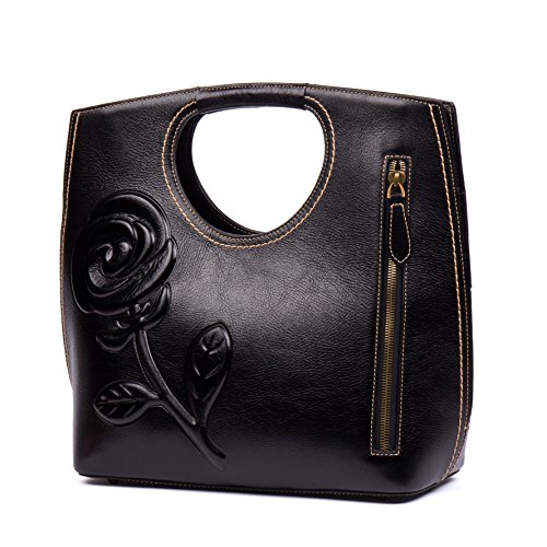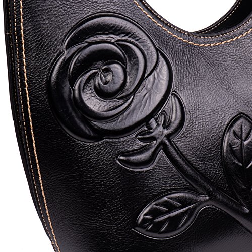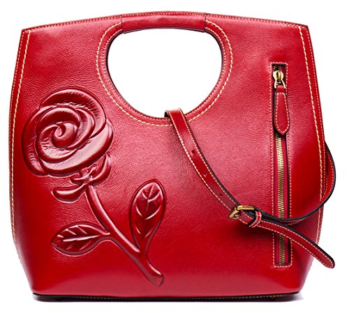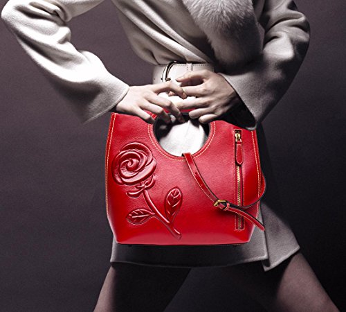 -. Feature : (L*W*H):13.4"X6.3"X14.3",Weight:1.69KG / Top layer cowhide leather with good tensile resistance. / Embossed floral design,simple and neat appearance show the charming retro style. / 45" removable & adjustable shoulder strap,could be worn as a cross-over or hand bag / Interior features : 2 zippered pocket at one side and 2 open pockets at other side, large central space for wallet ,make up bag,phone ,sunglasses or umbrella