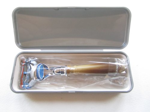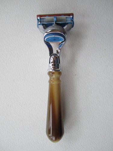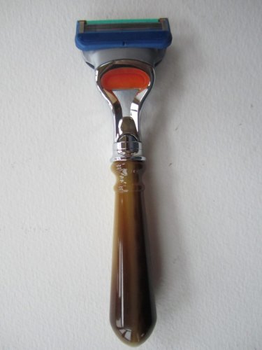 Product Description FUSION safety razor, attractive styling, large brown mottled handle. Accepts gillette fusion blade cartridges, easy on and off release.