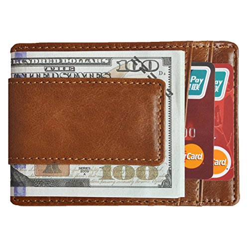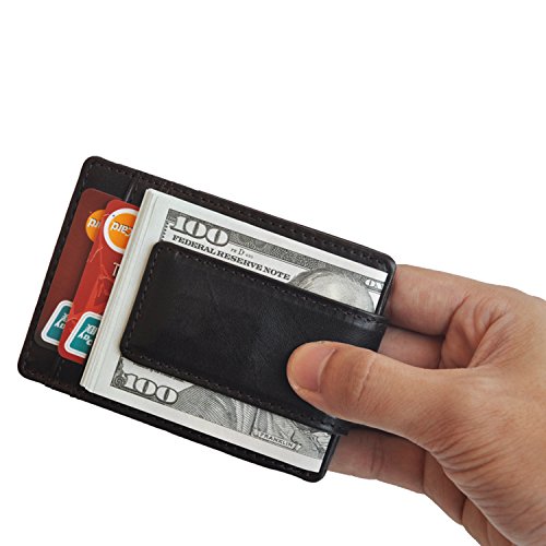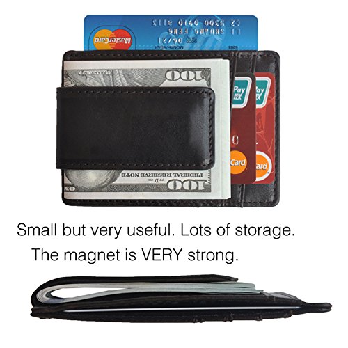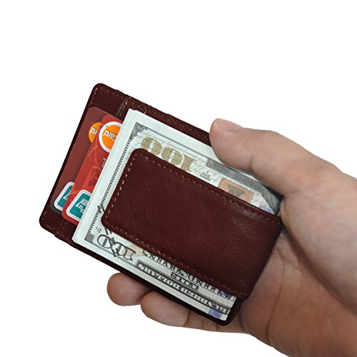 -. Feature : 100% Genuine Leather (Softer, more Breathable and Glossier) / Measures: 4.13" x 2.95" x 0.39" (10.5cm x 7.5cm x 1cm) / Minimalist & Slim, Perfect fit in Front Pocket, Good Choose to replace bulky wallet. / Super Powerful Magnetic Money clip, NO Dropping Card/Money / Featuring 6 separate RFID protected credit card slots, and a hidden side sleeve which can carry your id, receipts, coins, coupons, or gift